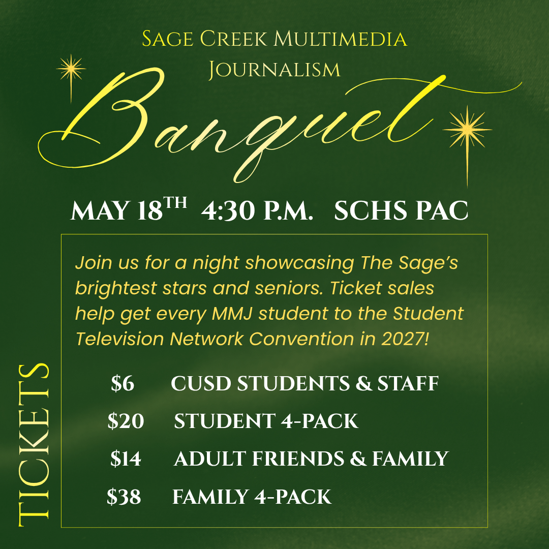 Join the Sage Creek Multimedia Journalism for a night showcasing The Sage’s brightest stars and seniors. Ticket sales will help get every MMJ student to the Student Television network Convention in 2027! Take advantage of our discounted pricing for advance sales, 4-pack pricing is only available in advance. We look forward to seeing you all there to celebrate our student achievements and showcase their hard work!